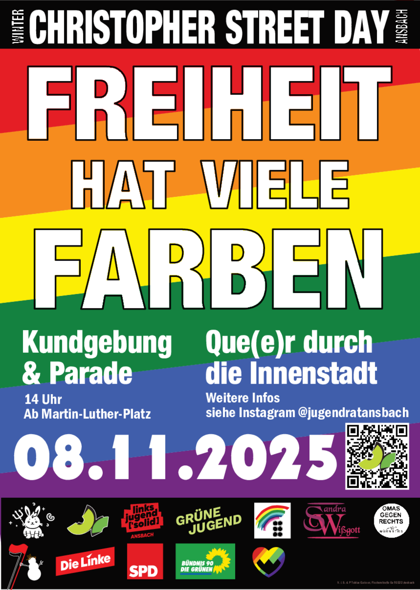 Am 8. November 2025 heißt es wieder: Ansbach wird bunt! Der Jugendrat Ansbach und seine Partner laden zum Winter-CSD (Christopher Street Day) auf den Martin-Luther-Platz ein. Ab 14 Uhr demonstrieren Menschen aus der Region gemeinsam für Liebe, Vielfalt und Freiheit. Unter dem Motto „Freiheit hat viele Farben“ will der Winter-CSD auch in der kalten Jahreszeit ein starkes Zeichen gegen Diskriminierung setzen.